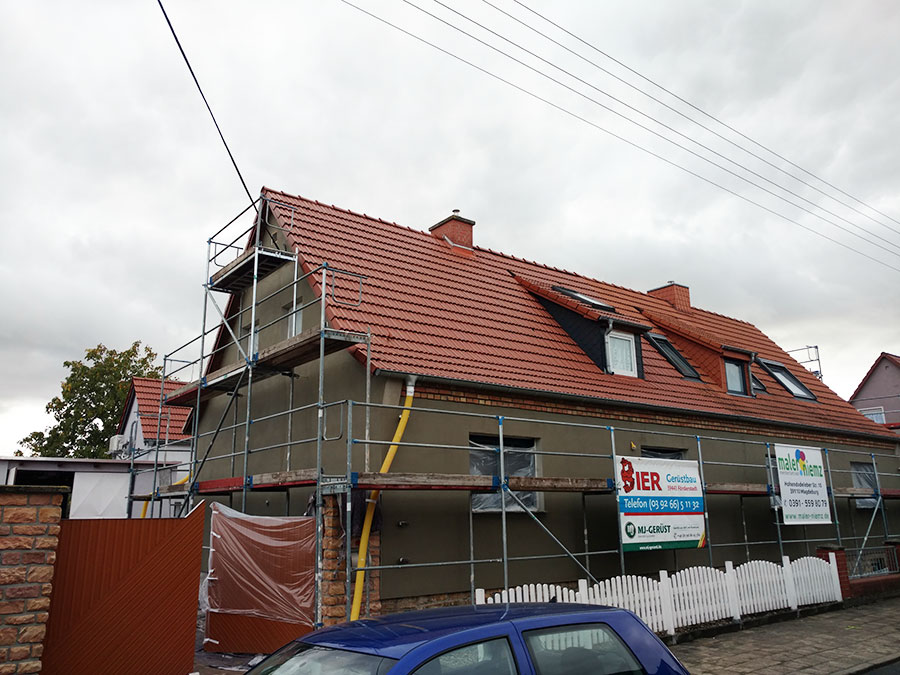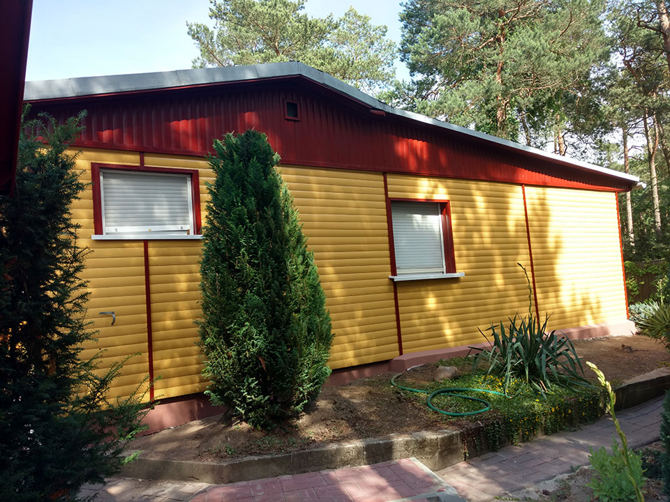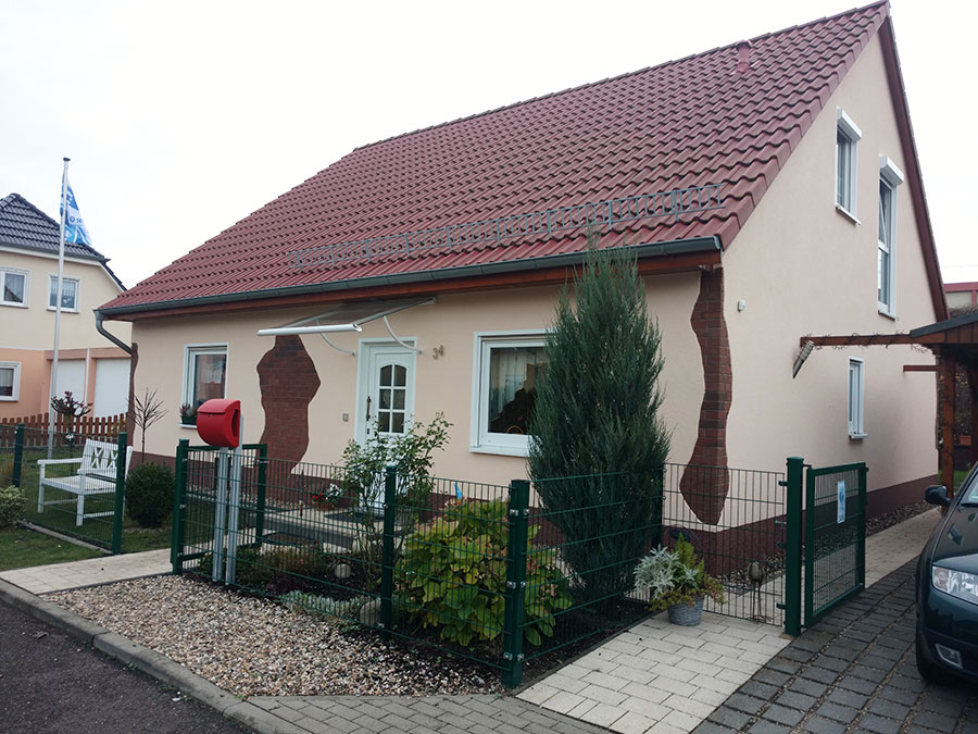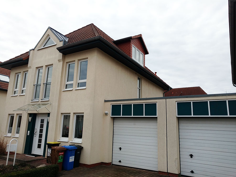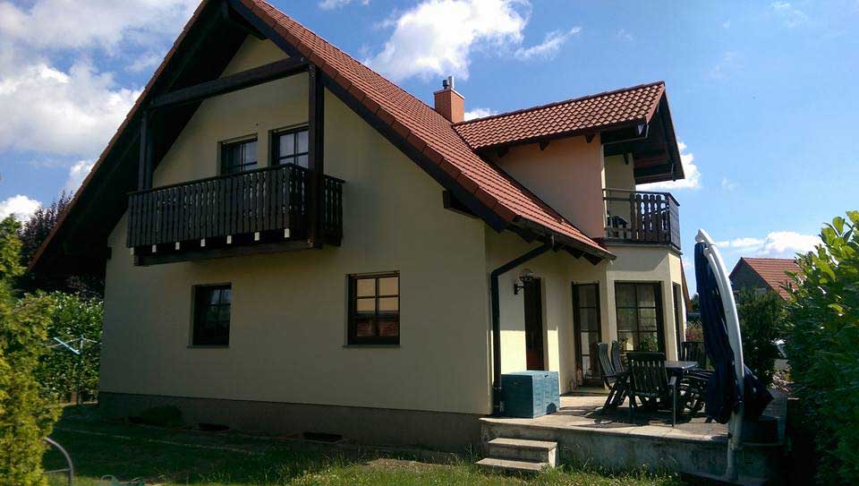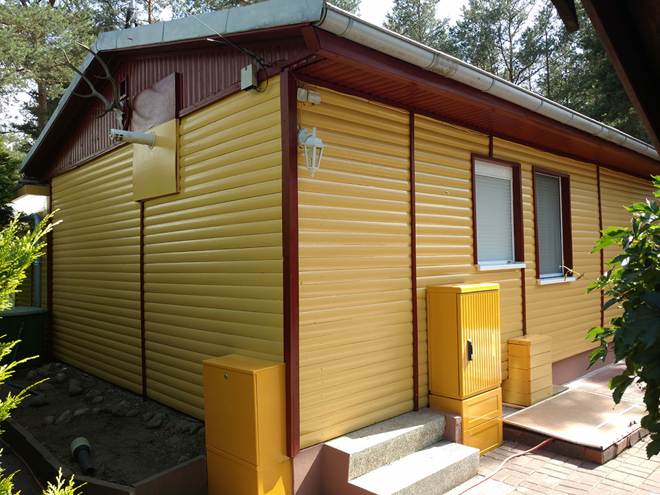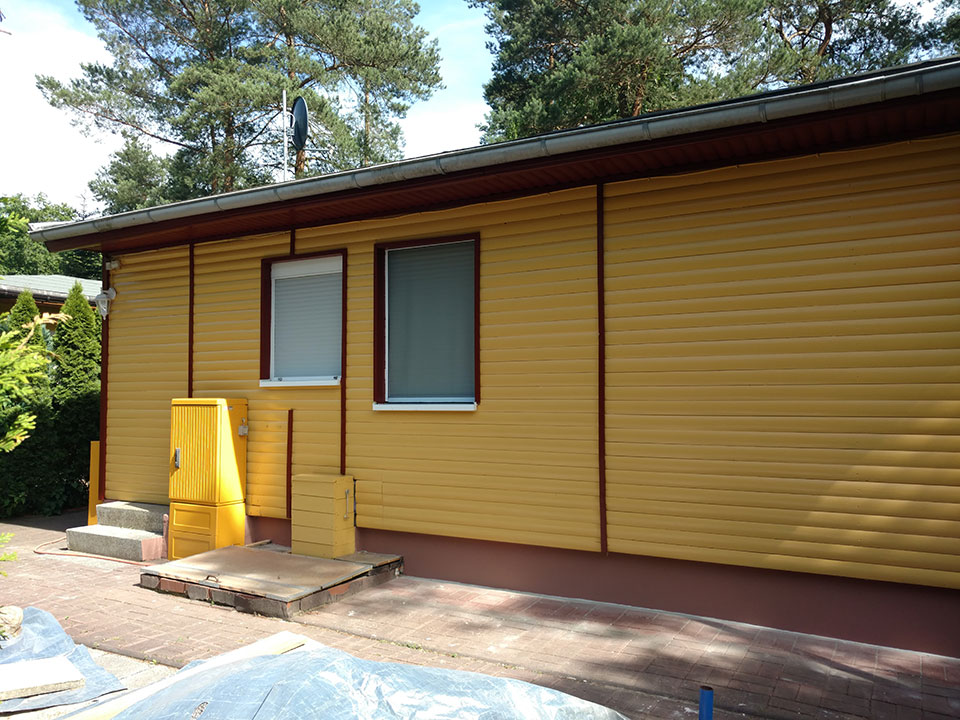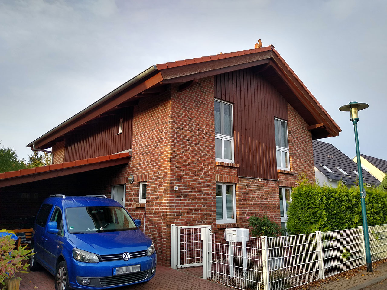 Im Wohngebiet Berliner Chaussee haben wir an diesem Haus den Fassadenanstrich erneuert. Das Holz wurde geschliffen und teilweise neu verschraubt. Als nächstes wurde Isoliergrund aufgetragen und dann mit Wetterschutzfarbe angestrichen.