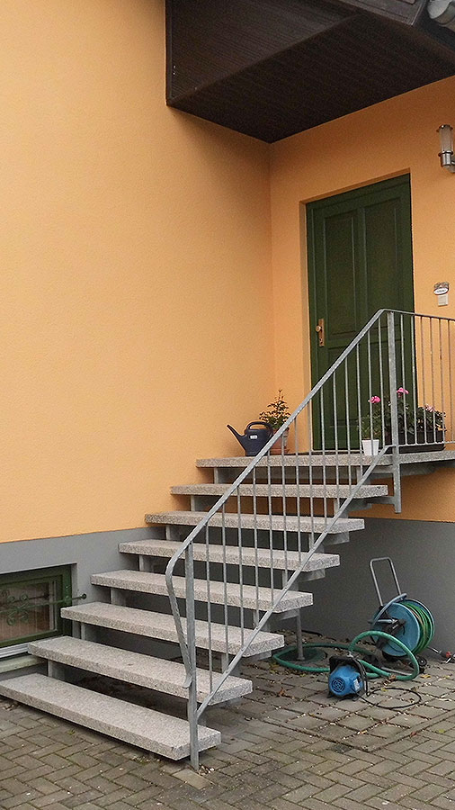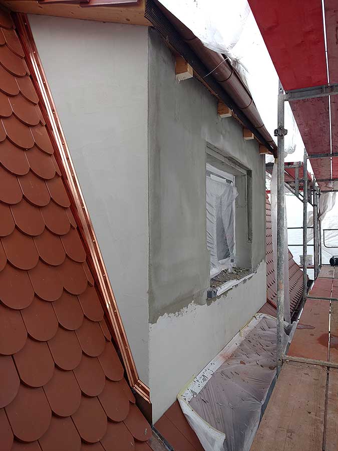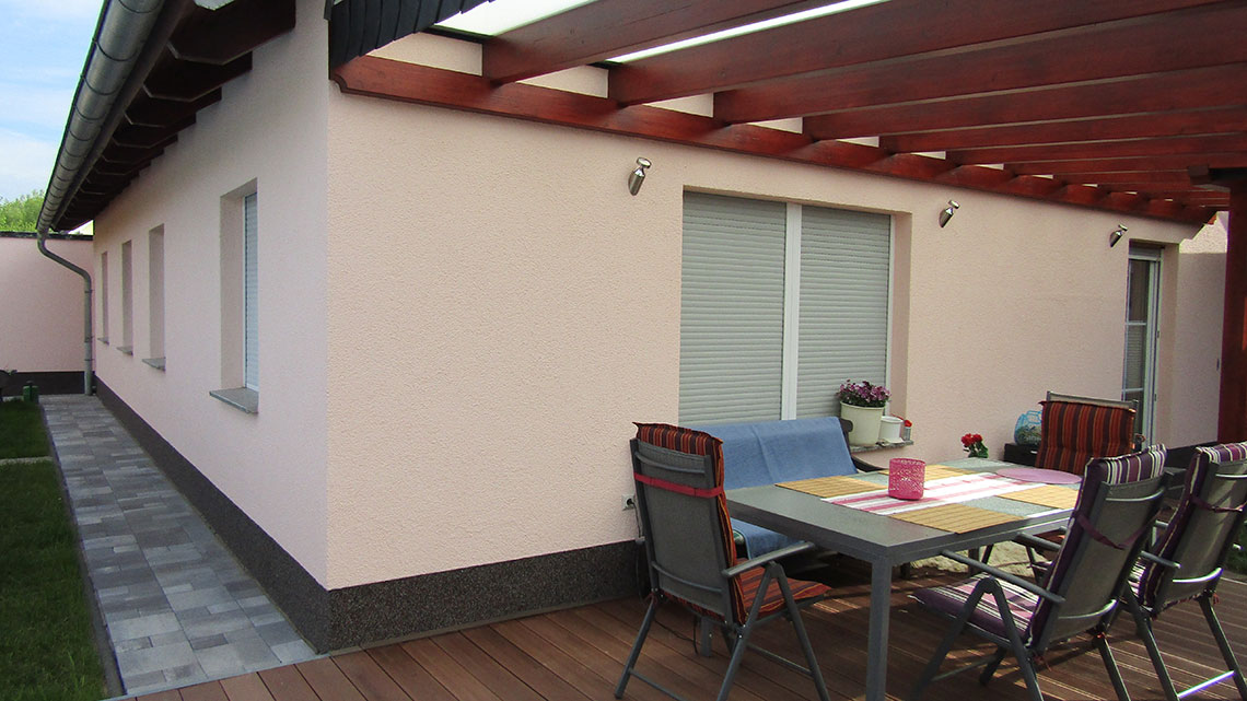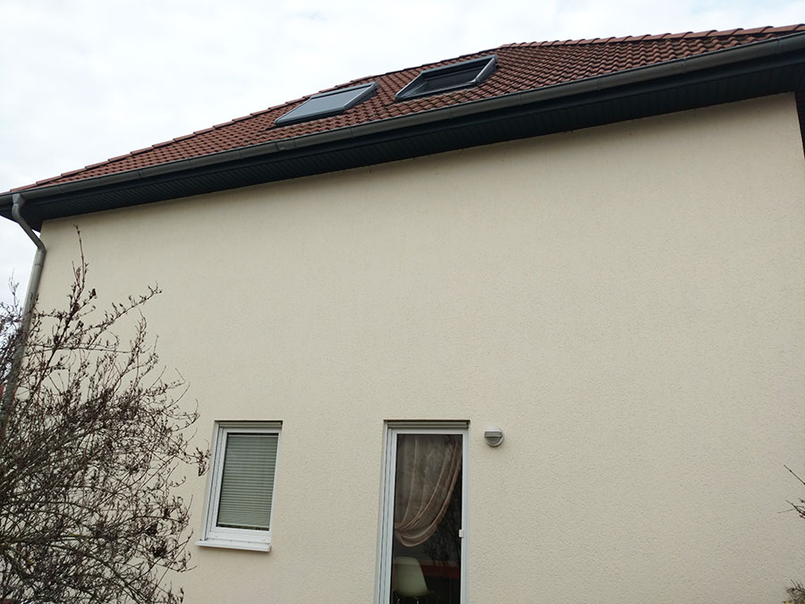 Hier haben wir die Fassade gereinigt, grundiert und neu gestrichen. Ein paar Ausbesserungen am Putz haben wir vorab auch vorgenommen.