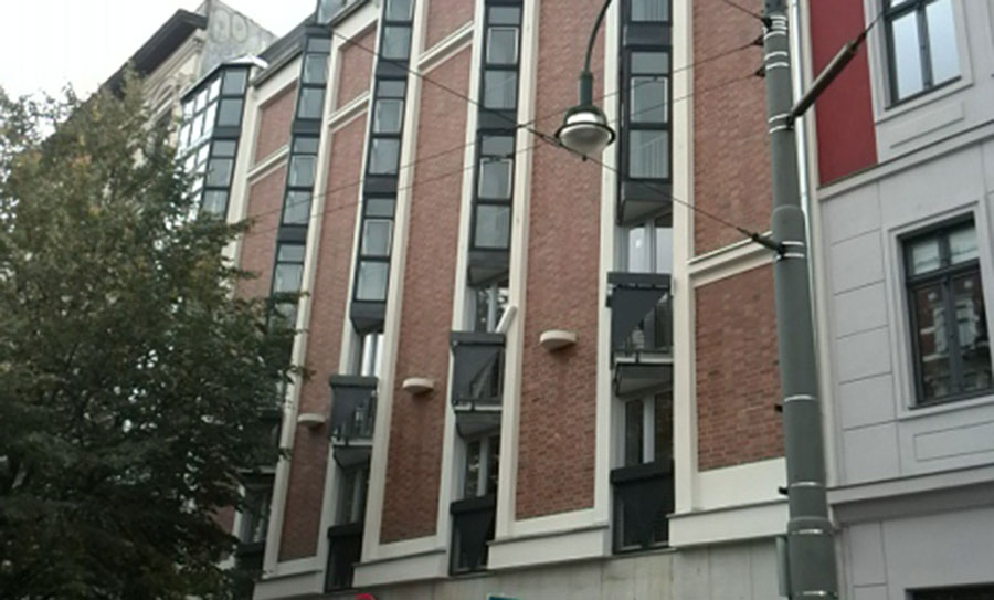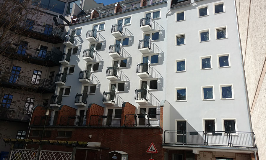 Die Klinker der Hausfassade wurden gereinigt und versiegelt. Die Metallelemente wurden neu lackiert. Die Fassade der Hofseite wurde mit Filzputz beschichtet und gestrichen.