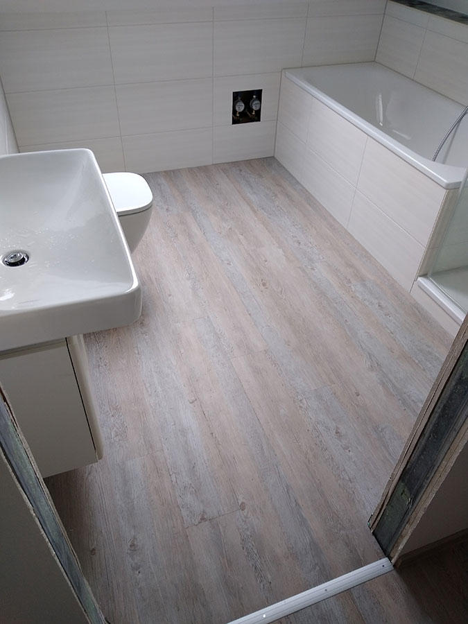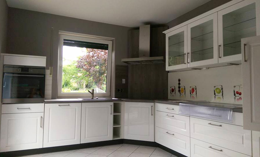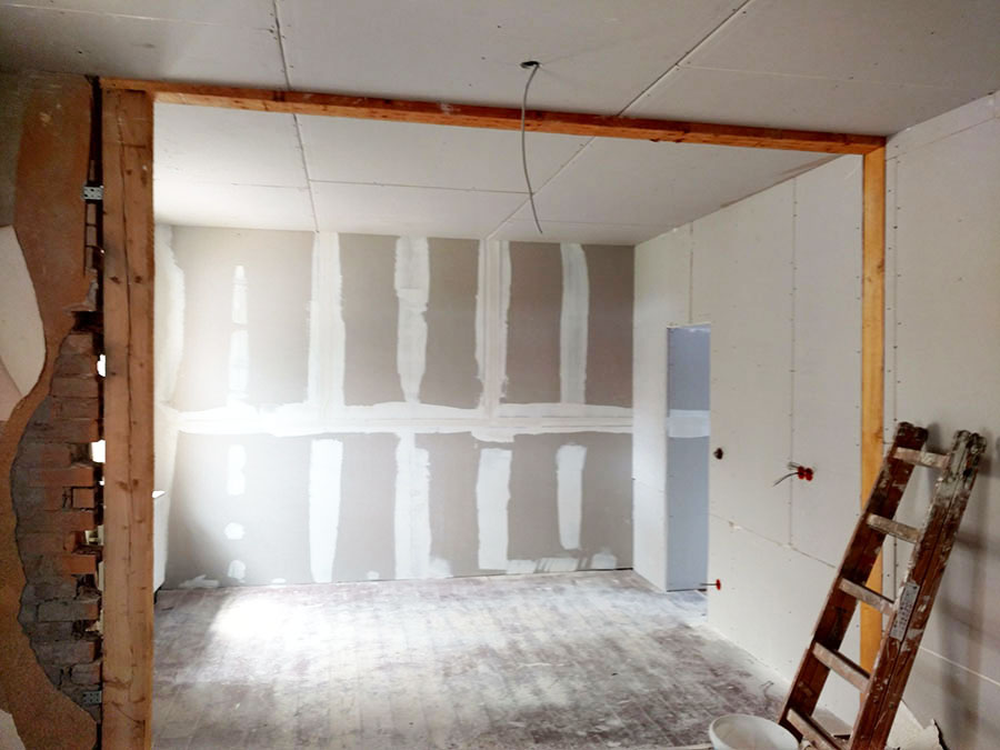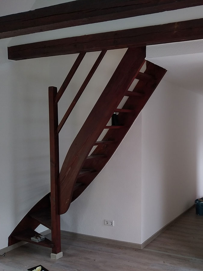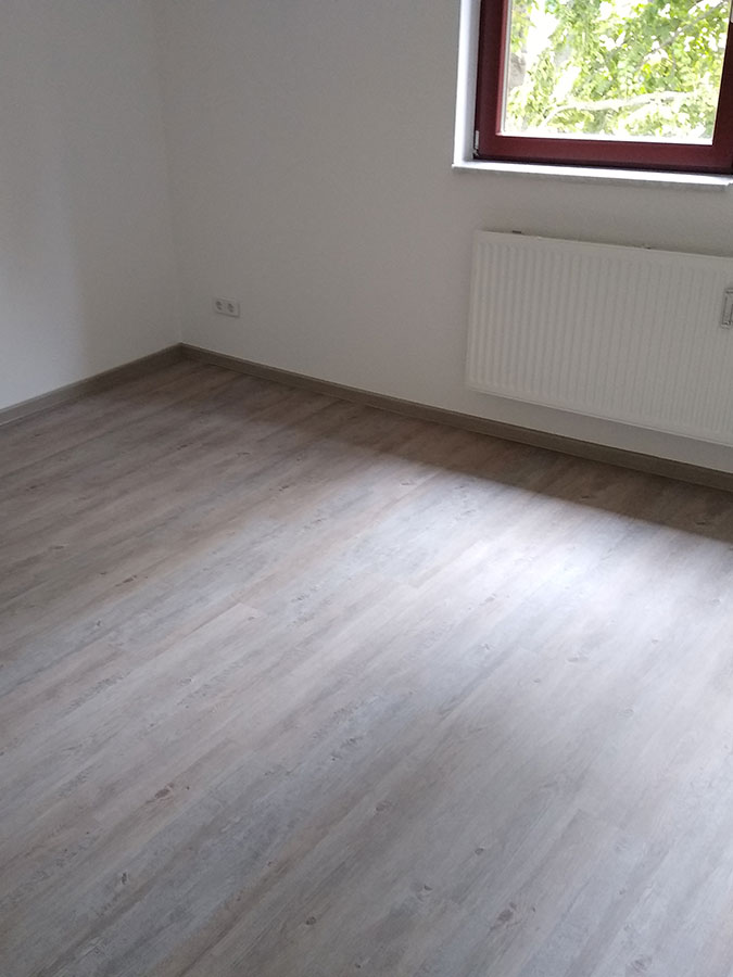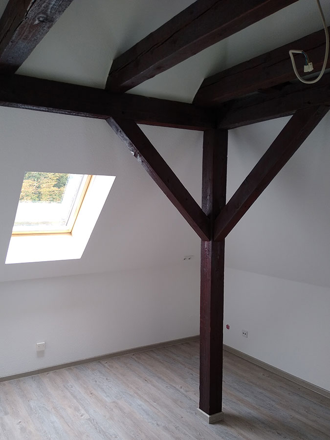 Hier war eine Komplettsanierung fällig. Die Küche wurde komplett entkernt. Die Balken an der ehemaligen Wand wurden neue gezogen, die Holzimitatverkleidung entfernt, neue Trockenbauwände gestellt und gestrichen. Der Fußboden in der Küche wurde geschliffen und lackiert. Im Dachgeschoss wurde Designbelag verlegt.