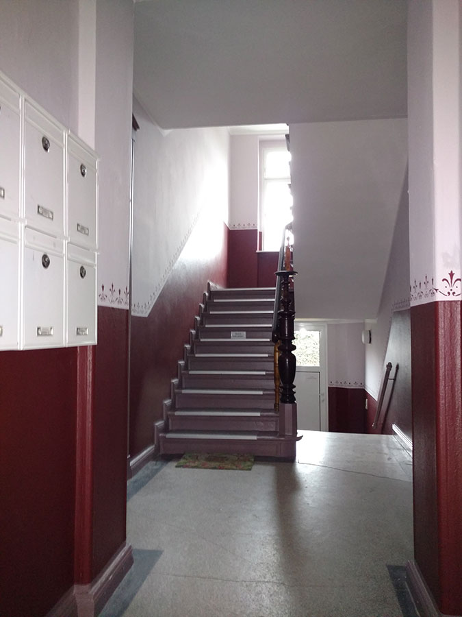 In diesem Mehrfamilienhaus haben wir das Treppenhaus neu gestrichen. Hierbei kam Schabloniertechnik zum einsatz. Außerdem haben wir den Fußboden neu verlegt.